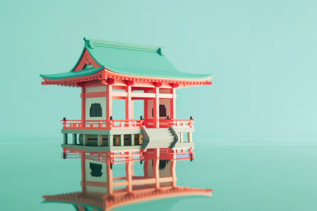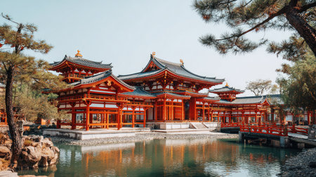 A detailed image displays an architectural structure, potentially a temple, constructed with red and dark roofing. Situated near a body of water, the building features intricate design elements. The scene, captured under a clear sky, suggests an outdoor setting possibly during daylight. The image could be used for travel, cultural, or historical publications.