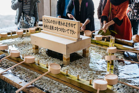 Holy water shrine with tourists scooping water for washing their hands before going to shrine at The Hokkaido Shrine (Hokkaido Jingu) in winter in Sapporo. Hokkaido, Japan.