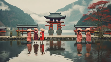 A group of women are standing in front of a building with umbrellas. The scene is set in a beautiful, serene location with a lake in the background. The women are dressed in traditional clothing