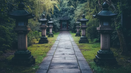 Path lined with traditional Buddhist lanterns in forest leading to a shrine, calm composition and open space
