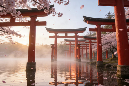 A stunning torii gate stands at sunset, surrounded by still water, creating a picturesque reflection. This serene scene evokes tranquility and beauty.