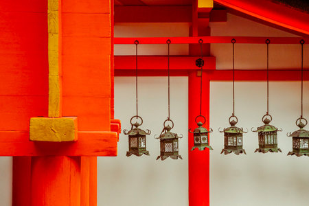 Nara, Japan - 5th March 2018 - A view of lanterns hanging at Kasuga Taisha shrine, framed by red wooden structures.