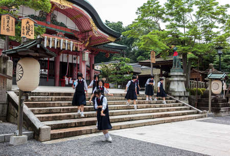 Kyoto, Japan - June 22, 2010 - High school girls wearing school uniforms at Fushimi Inari shrine on June 24, 2010 in Kyoto, Japan Fushimi Inari shrine is one of the most popular shinto shrines in Kyoto