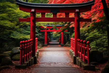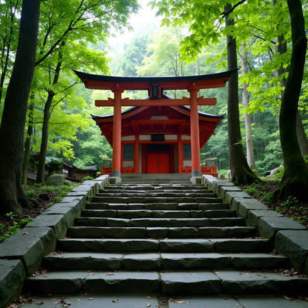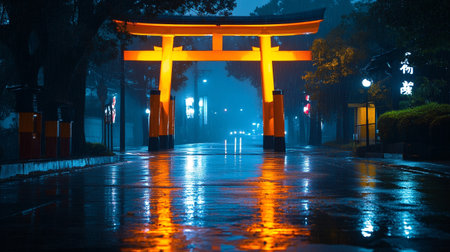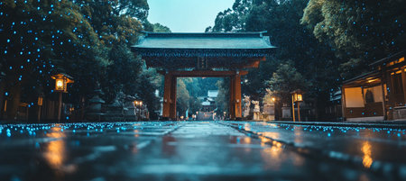 A Torii Gate Illuminates a Rainy Path, Ancient Sanctuary Beckons through Nature s Embrace.