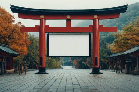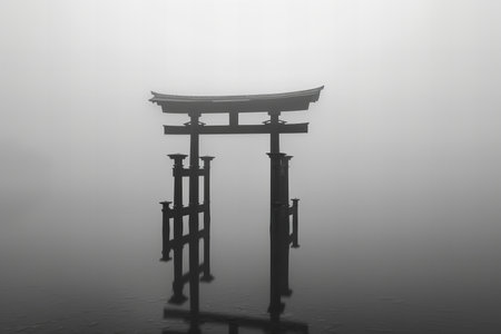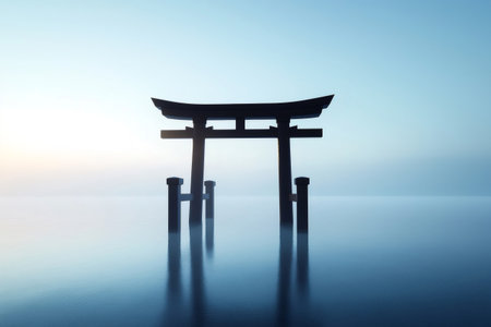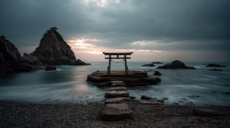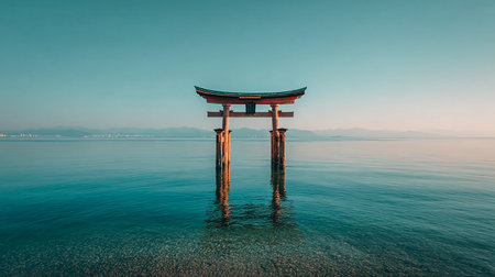 An image showcases a traditional Japanese torii gate situated in the ocean. The scene features a gate with pillars in the water, framed by rocky formations and a serene sea. The composition, bathed in soft lighting, highlights the gate against a clear sky, suitable for various applications.