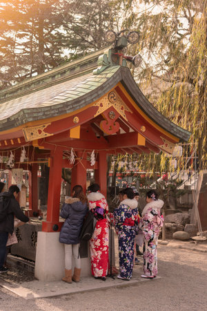 tokyo, japan - january 28 2020: Japanese women in kimono who purify themselves with temizuya water before praying in the Asakusa shrine.