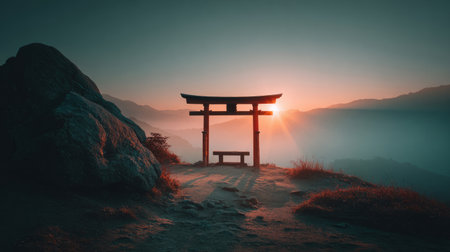A wooden Torii gate stands prominently in the center of the image, set against a backdrop of a misty landscape. Soft, warm sunlight filters through the fog, illuminating the scene and enhancing the earthy tones. The composition includes trees and mountains, suggesting a serene outdoor environment, suitable for various commercial uses.