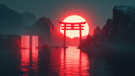 Vibrant digital art piece featuring a torii gate bathed in a glowing, crimson sun, set against a surreal landscape of mountains, rocks, and water, with neon red light illuminating vertical structures. The image showcases a striking contrast of colors and shapes, creating a dreamlike and captivating scene.