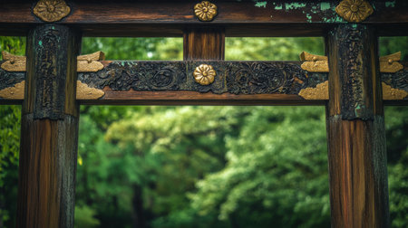 A wooden torii gate features detailed carvings and gold accents, standing proudly amidst a vibrant green forest, creating a serene and peaceful ambiance.