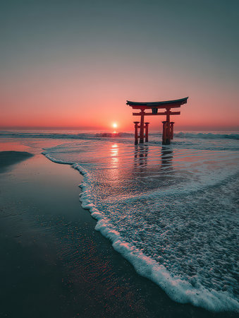 Capture the tranquil beauty of a torii gate during sunset, with gentle waves lapping at the shore. This serene setting evokes peace and natural splendor.