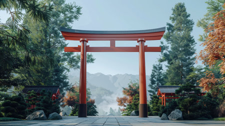 A beautiful torii gate stands amidst lush green trees and a stunning mountainscape, creating a serene and tranquil atmosphere perfect for relaxation and reflection.