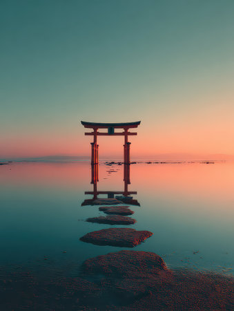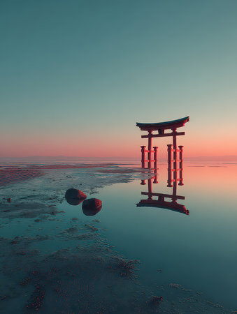 A stunning view of a torii gate reflecting on tranquil waters at sunset, showcasing serene beauty and harmony in nature. Perfect for travel and landscape themes.