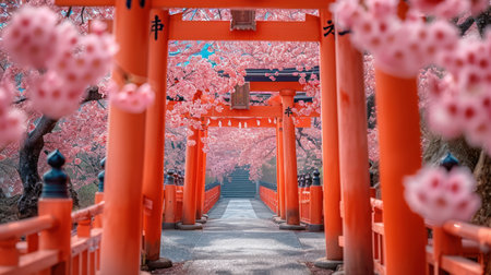 Beautiful cherry blossoms in the red Torii gate at Fushimi Inari Shrine in Kyoto, Japan