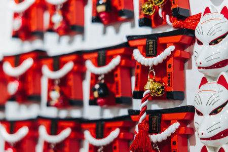 Traditional Japanese tourist souvenirs and gifts from Kyoto, Kansai, Japan, with daruma figures, kitsune fox, tengu mask, refrigerator magnets, toys figurines, key ring keychain, in a local vendor gift shop