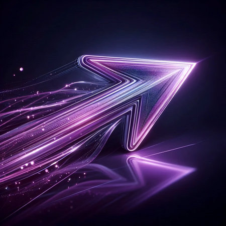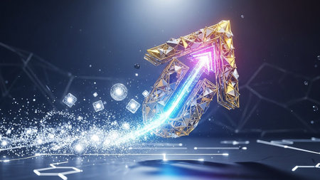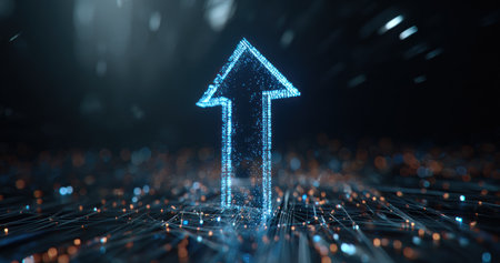 Abstract digital arrow moving upward, symbolizing progress and growth in technology and data analysis, with glowing particles and dark background creating futuristic atmosphere