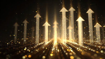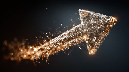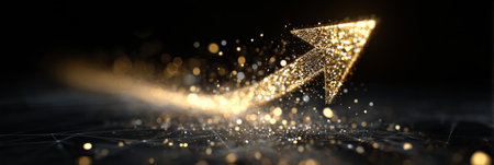 Shimmering golden arrows rise upward, symbolizing growth and success against dark background filled with sparkling particles. This captivating image evokes sense of aspiration and achievement