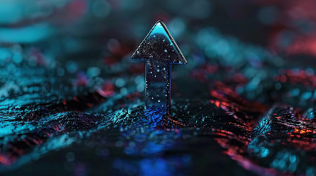 Metallic arrow symbol rises above textured surface, illuminated by vibrant blue and red lights, creating dynamic and futuristic atmosphere. contrast enhances visual appeal, evoking sense of upward