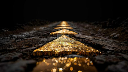 Pathway of golden arrows illuminated by sparkles leads into darkness, creating magical and enchanting atmosphere. shimmering effect adds sense of wonder and allure to scene