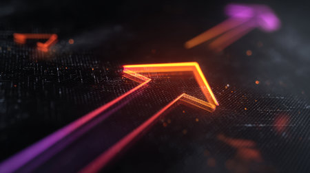 Dynamic arrows in vibrant colors create sense of movement and direction, set against dark, textured background. glowing effect adds modern and energetic feel to design