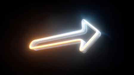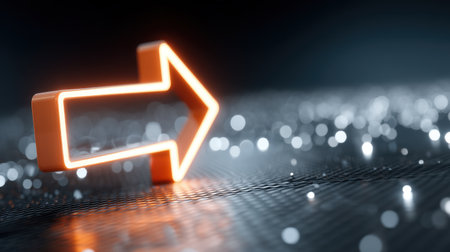 Glowing orange arrow points to right, created with light trails against dark background, symbolizing direction and movement. vibrant color adds energy and dynamism to image