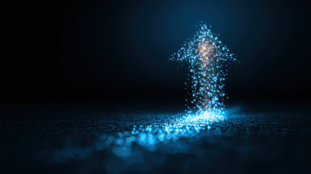 A mesmerizing upward arrow created from glowing particles shines brightly against a dark background, representing aspirations, growth, and potential for creative projects.