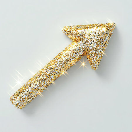 A D illustration of an arrow adorned with shimmering glitter and sparkling metallic highlights featuring vibrant gold and silver tones on a minimal background
