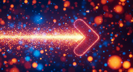 This stunning image features a glowing arrow crafted from light particles and sparks, symbolizing direction, innovation, and forward movement on a dark background.