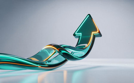 Glossy 3D upward arrow with flowing ribbon, symbolizing business growth, progress, and performance on clean background.