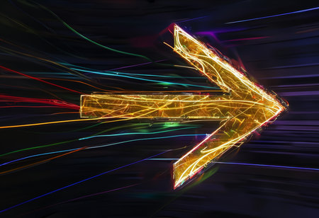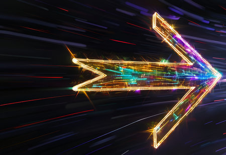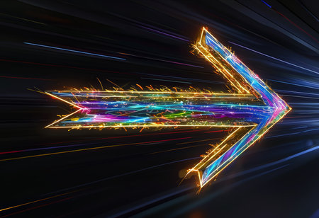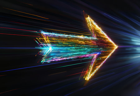 A vibrant neon arrow pointing right on a dynamic background with streaks of light.