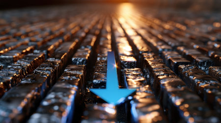 A captivating close-up view of metallic textures and patterns illuminated by dramatic lighting, featuring an arrow symbol that suggests direction in an industrial setting.