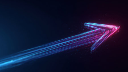A dynamic glowing neon arrow pointing upwards, symbolizing progress and innovation in a dark tech setting.