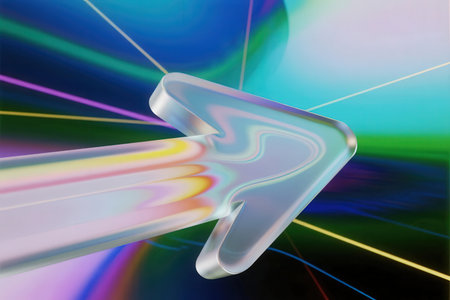 A luminous arrow made of glowing materials in vibrant shades of blue, orange, and pink points upward against a soft gray backdrop. This striking design emphasizes movement and direction, creating an energetic vibe.