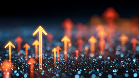 Digital arrow symbolizing growth and progress, designed with vibrant orange bars against dark background. This conveys sense of upward movement and financial success