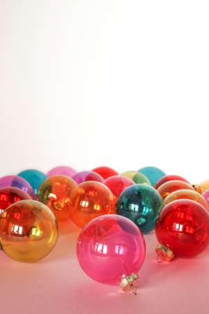 Colourful translucent glass Christmas baubles in whte backround. Place for text.