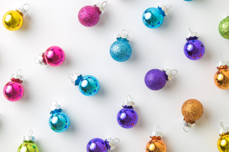 Colorful Christmas baubles on white background with hard shadows.