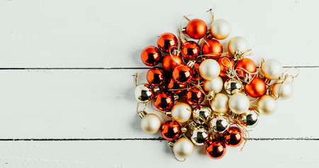 Red and golden Xmas balls decoration pile. New year greeting. Festive backdrop.