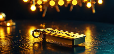 Gold key chain with Christmas lights on a dark background. Christmas concept.