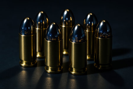 Seven gleaming brass 9mm ammunition rounds standing upright on a dark surface, reflecting light. represents concepts of power, danger, security, and conflict.