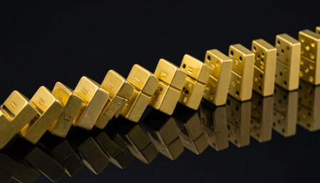 Domino pieces with embedded gold bars and small market icons toppling in a chain reaction on a reflective black surface, illustrating economic ripple effects