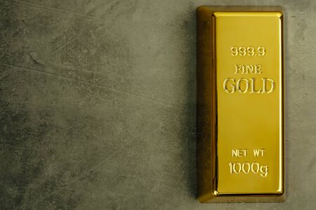 Ingot of pure gold metal bullion on a gray textured background