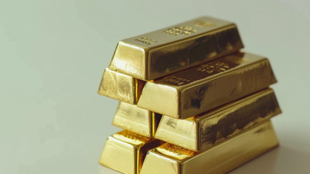 Luxurious gold bars stacked closely together, reflecting light with warm glow. surface is slightly textured, showcasing richness and value of gold
