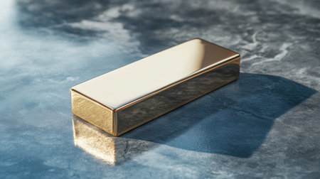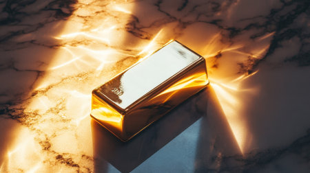 A stunning gold bar rests on a marble surface, bathed in natural light that creates captivating reflections and highlights its elegance while showcasing wealthy aesthetics.