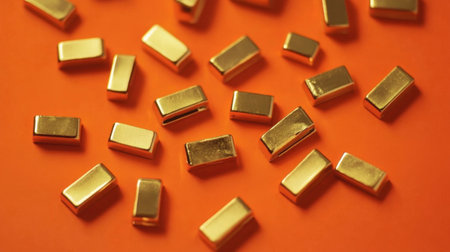 This image showcases a collection of small gold bars arranged on a vibrant orange background, symbolizing luxury and wealth. The shine and texture enhance its visual appeal.