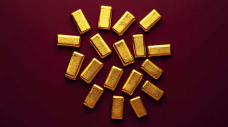 A dynamic arrangement of gleaming gold bars creates an eye-catching pattern against a rich red background, symbolizing luxury and wealth.