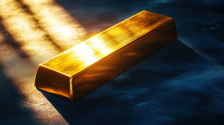 A stunning gold bar rests on a surface, capturing warm light and creating dramatic shadows. This close-up image showcases the richness and elegance of luxury.