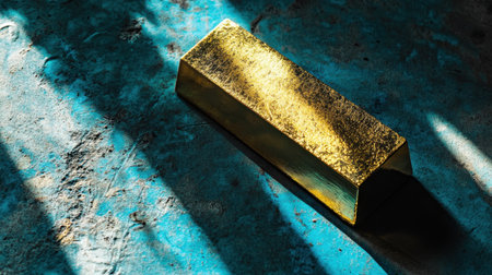 A stunning golden bar placed on a blue textured surface, showcasing the interplay of light and shadows, perfect for topics on luxury, finance, and opulence.