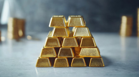 A striking arrangement of gleaming gold bars stacked in a pyramid format, symbolizing wealth and prosperity against a soft, blurred background.