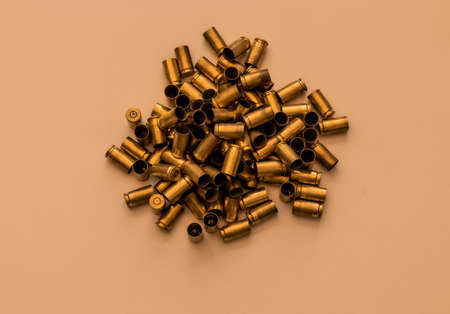 Pile of used bullet cartridges on beige background