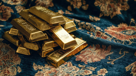 A pile of gold bars, stacked high on a reflective surface, representing economic power, stability, and prosperity in a luxurious setting.