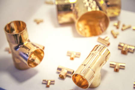 Gold, silver and bronze pipes on a white background. Selective focus.